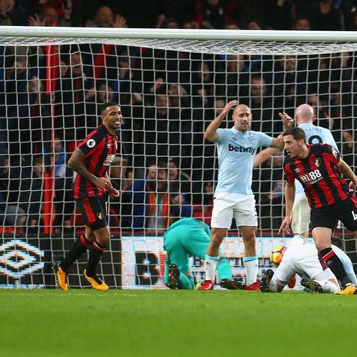 Marko Arnautovic scoorde twee keer voor West Ham en bracht de Londenaren in de 89e minuut op voorsprong (2-3), maar Bournemouth maakte, geheel onverwachts, nog een comeback via de hand van Callum Wilson in de 93e minuut. De scheidsrechter zag de handsbal niet en negeerde de grensrechter die vlagde voor buitenspel, dus bleef de goal staan en werd West Ham in de allerlaatste minuten de overwinning ontnomen.